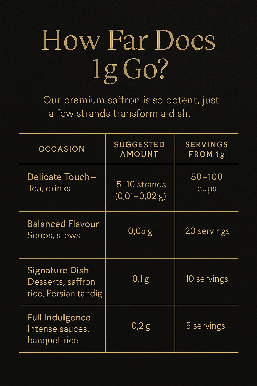If you refer to the below, there is a helpful table on an estimate use of saffron strands for dishes, drinks and uses.